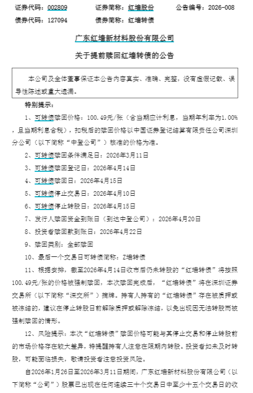 红墙转债自4月10日停止交易。截至4月9日收盘,红墙转债二级市场价格为104.132元/张。